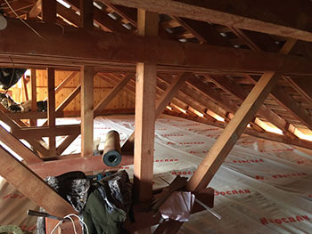 На сегодняшний день подрядная организация уже полностью смонтировала металлическое покрытие на крыше, заменила стропильную систему и обрешетку, обработав все деревянные конструкции огнебиозащитным составом, восстановила кирпичные трубы (переделала, отштукатурила и окрасила), а также уложила 2/3 утеплителя. Укладку оставшейся части теплоизоляционного слоя бригада планирует завершить к середине апреля.