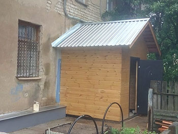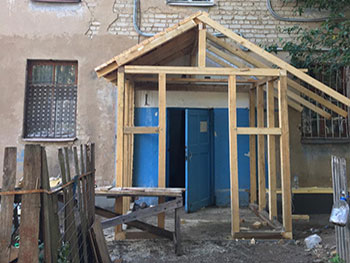 На фотографиях «до» отчетливо видно, в каком аварийном состоянии находилась нижняя конструкция жилого дома. С годами цокольная часть разрушилась, а отсутствие отмостки по периметру всего здания ставило под удар весь дом – в сезон дождей и обильного таяния снега огромные скопления воды регулярно подтапливали и без того развалившийся фундамент. Тамбур входа также требовал скорейшего ремонта - от ветхости его изрядно покосило от чего дверь перестала закрываться окончательно.