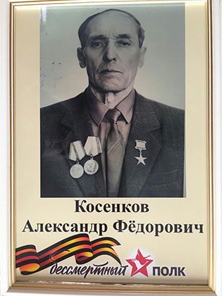 «Мой дедушка Косенков Александр Федорович был призван в ряды Советской Армии в 1941г. в г. Донбасс. Семья сразу поехала к родственникам в Смоленскую область, где несколько раз попадала под обстрел. Очень тяжелое время наступило для них. Голод, холод, ожидание и неизвестность. До 1943 г. мой дедушка был участником боевых действий. И вернулся домой! Поступил на шахту «Золотое». Был проходчиком, горнорабочим очистного забоя. В годы ВОВ находился в эвакуации, работал шахтером».