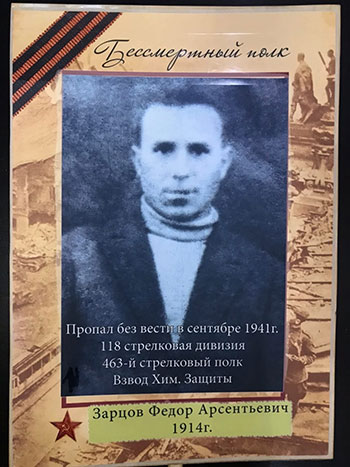 «Зарцов Федор Арсентьевичи в войну служил в 118 стрелковой дивизии, 433-й стрелковый полк, взвод химзащиты. Дивизия была сформирована в г. Кострома в 1940 г.
