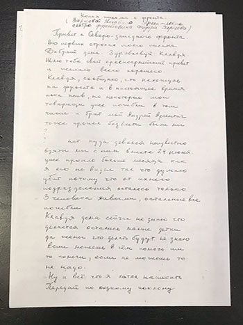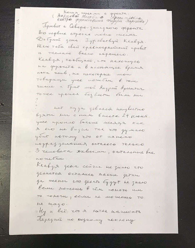 На фото представлена копия фронтового письма, которое написал Федор Арсентьевич своим родным: «…сообщаю, что нахожусь на фронте и в настоящее время пока жив, но некоторые мои товарищи уже погибли, в том числе и брат мой, Андрей Арсентьевич…Уже прошло больше месяца, как я его не видел, так что думаю, убит, потому что от их подразделения осталось только 3 человека живыми, остальные все погибли…Клавдия (сестра – примеч.ред.), дома сейчас не знаю, что делается. Остались малые детки да жены. Что делать будут, не знаю. Если можешь в чем помочь им, то помоги, если не можешь, то не надо. Ну и все, что я хотел написать. Передай по низкому поклону».