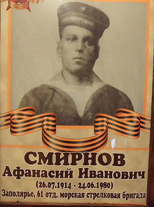 «Мой дедушка Смирнов Афанасий Иванович в годы Великой Отечественной Войны был командиром отделения подвижных средств роты связи - сержант 61 отделения морской стрелковой бригады (в/ч 46 стрелковый полк 83 стрелковой краснознаменной дивизии 14 отделение армии). Имел множество наград, в том числе награжден Медалью «За отвагу»: при преследовании противника на правом фланге Кестеньского направления под сильным пулеметным огнем противника, рискуя жизнью, доставлял приказания авангардным подразделениям, чем обеспечил ценное выполнение боевого задания. На Мурманском направлении в бою за населенный пункт Наутси под непрерывным минометно-артиллерийским огнем противника систематически доставлял приказания подразделениям, в результате чего задачи командованием доводились с точностью и всегда выполнялись».