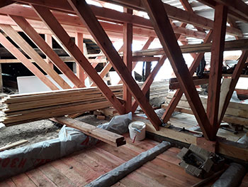 Согласно заключенному договору, подрядная организация на объект вышла в двадцатых числах мая. Задача была не из легких, ведь крышу нужно было восстанавливать практически с нуля. На сегодняшний день благодаря качественной, оперативной и слаженной работе опытных специалистов работы готовы уже на 80%. В ходе капитального ремонта бригада строителей полностью обновила кровельное покрытие, заменила, обработала и смонтировала все деревянные конструкции кровли, а также привела в порядок кирпичные трубы. В настоящее время подрядчик занимается утеплением перекрытий.