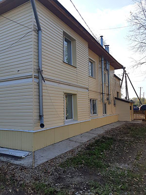 Уже несколько лет фасад жилого здания находился в крайне плачевном состоянии: обшивка была практически разрушена, поражена гнилью и не выполняла свою основную функцию – защиту от атмосферных осадков, в результате чего стены регулярно намокали. Кроме того, в неудовлетворительном состоянии находилась отмостка дома, двери и окна в подъезде подлежали замене, по цоколю были обнаружены многочисленные трещины, штукатурный слой также был сильно поврежден, из-за чего стены обрели блеклый неухоженный вид.