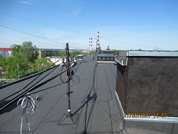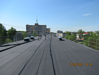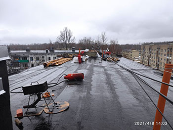 В ходе капитального ремонта подрядная организация произвела полное устройство кровельного ковра из современных полимерных материалов, заменила утеплитель и канализационные трубы выше кровельного покрытия, отремонтировала вентиляционные вытяжки, установила пожарное ограждение по всему периметру крыши, а также смонтировала новую систему организованного водостока.